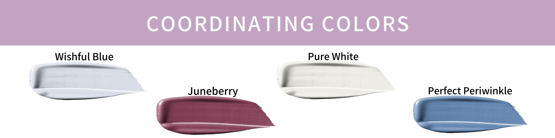 But we aren’t leaving you with just that, Sherwin-Williams has come up with the perfect palette of coordinating colors to accent the color of the month perfectly! We have Wishful Blue (SW6813), Juneberry (SW6573), Pure White (SW7005), and Perfect Periwinkle (SW9065).