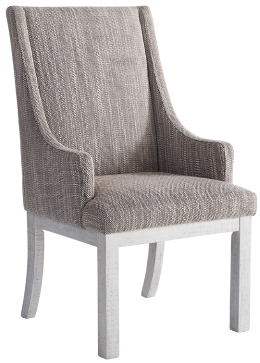 Have your fill of modern farmhouse style with this upholstered dining arm chair. A stylized shelter-wing design and woven oatmeal-colored fabric cater with beauty and comfort. And the distressed vintage white finish on its base is utterly charming.Read More