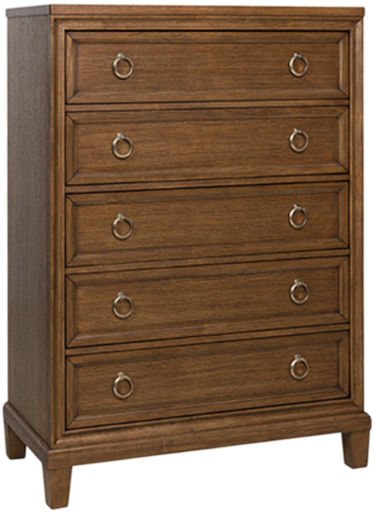 This striking chest of drawers looks equally at home in traditional or modern settings. A brown wood tone finish offers a casual modern look. Spacious drawers incorporate picture frame moulding and champagne goldtone pulls for a clean yet sophisticated design. Combined with the top's chic inset metal frame, it's a wonderful style awakening in the bedroom.Read More