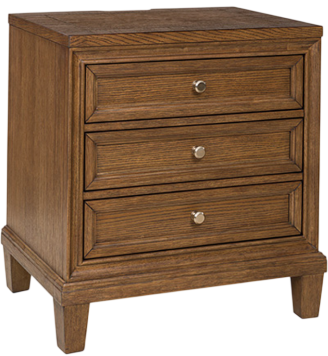 This striking nightstand looks equally at home in traditional or modern settings. A brown wood tone finish offers a casual modern look. Spacious drawers incorporate picture frame moulding and champagne goldtone pulls for a clean yet sophisticated design. Combined with the top's chic inset metal frame, it's a wonderful style awakening in the bedroom.Read More