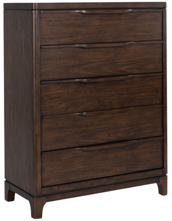 This chest of drawers exemplifies casual contemporary design with an urban vibe. Warm and inviting with a rich brown finish, it makes bedroom storage much sleeker thanks to five smooth-gliding drawers. Seamlessly incorporated wood handles are a subtle nod to mid-century modern design. What a stunning reflection of your simple-meets-elegant sensibility.Read More