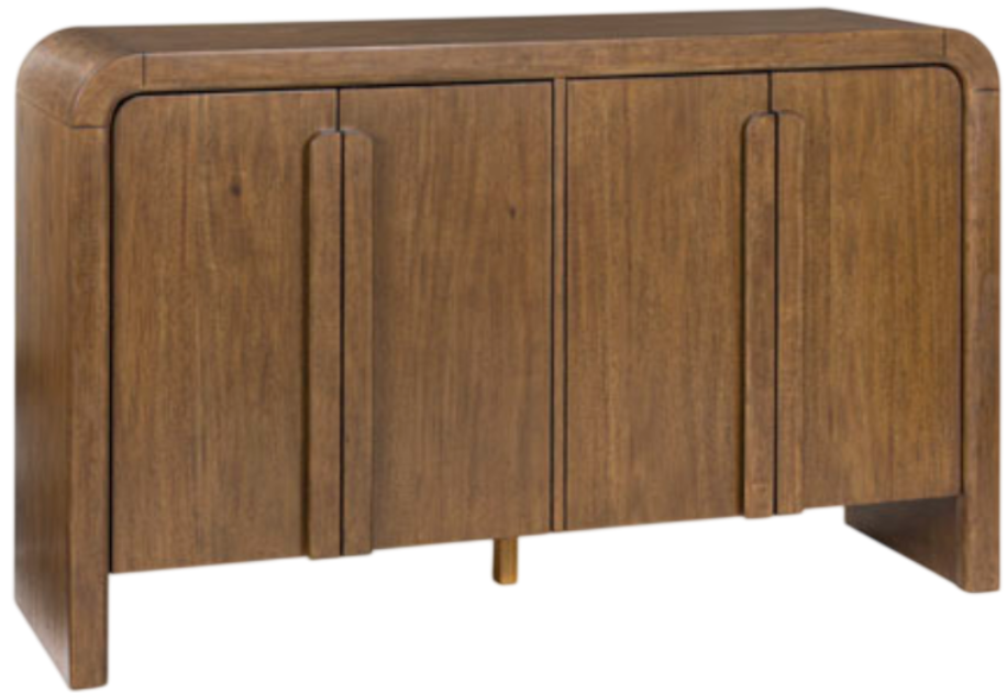 Server features a stylish waterfall edge design with two spacious double door cabinets dressed with integrated solid wood handles for an organic contemporary vibe