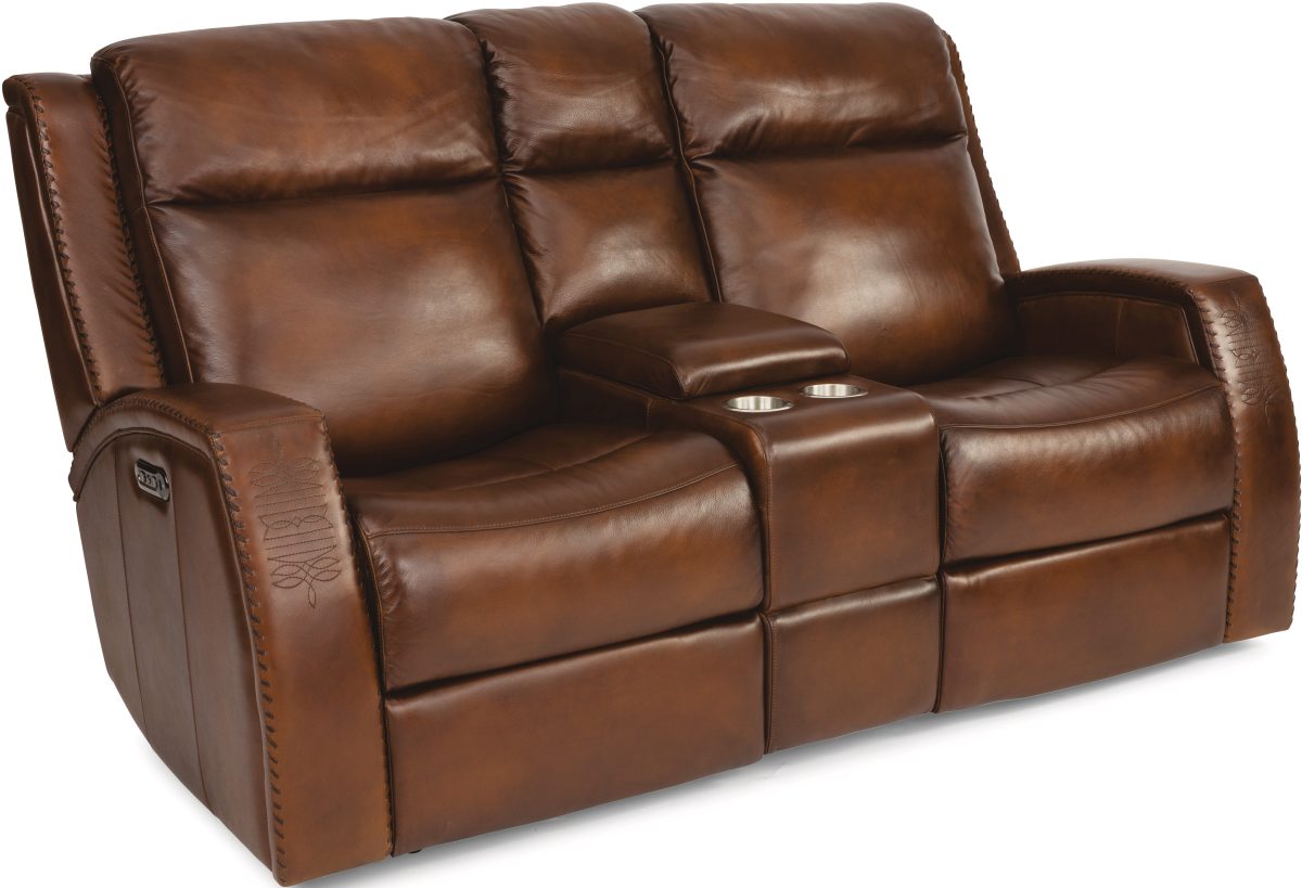 Find ultimate comfort with this statement piece. Inspired by cowboy boot designs, Mustang's intricately stitched arm design adds a unique, distinctive touch to this style. Large stitching in a contrasting leather throughout the piece adds yet another layer of texture and visual interest. Divided back cushions, subtle bucket seats, and fully padded footrests provide blissful sink-in comfort for long movie nights with friends and family.