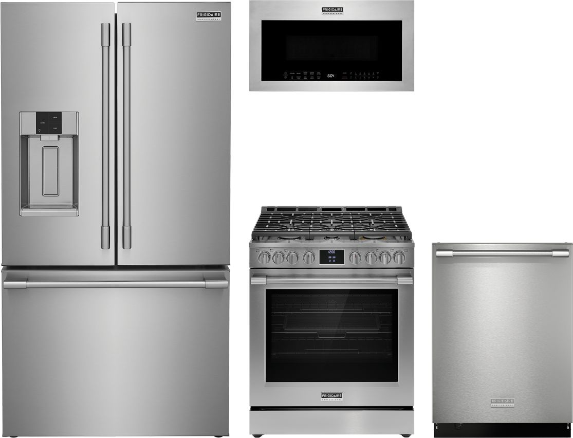 Frigidaire Professional® 4 Piece Stainless Steel Kitchen Package with a French Door Refrigerator, Freestanding Gas Range, Built In Dishwasher, and Over The Range Microwave.Read More