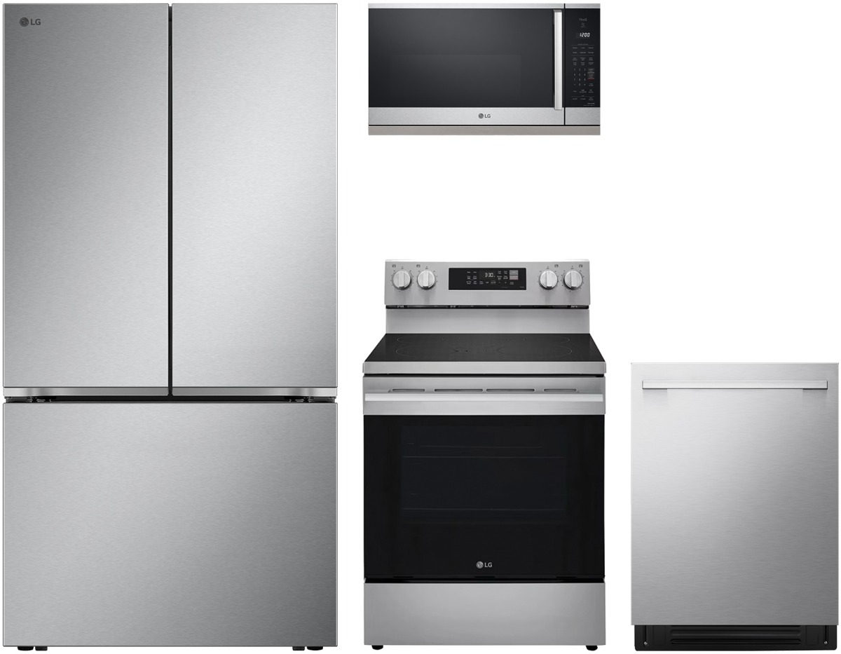 LG 4 Piece Stainless Steel Kitchen Package with French door refrigerator, top control built-in dishwasher, freestanding electric range, and over the range microwave.Read More