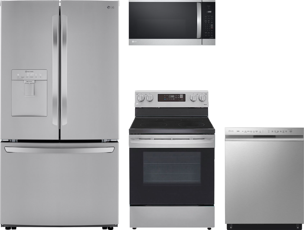 LG 4 Piece Stainless Steel Kitchen Package with a french door refrigerator, freestanding electric range, built in dishwasher, and over the range microwave.Read More