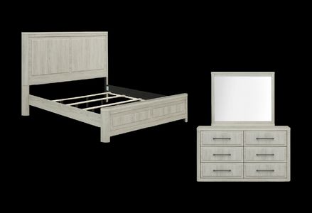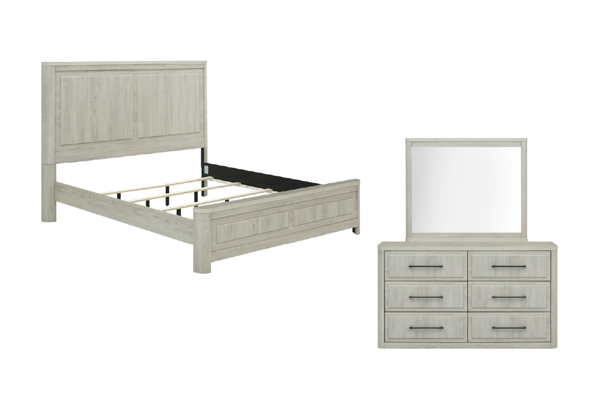 Set includes queen panel bed, dresser and mirror