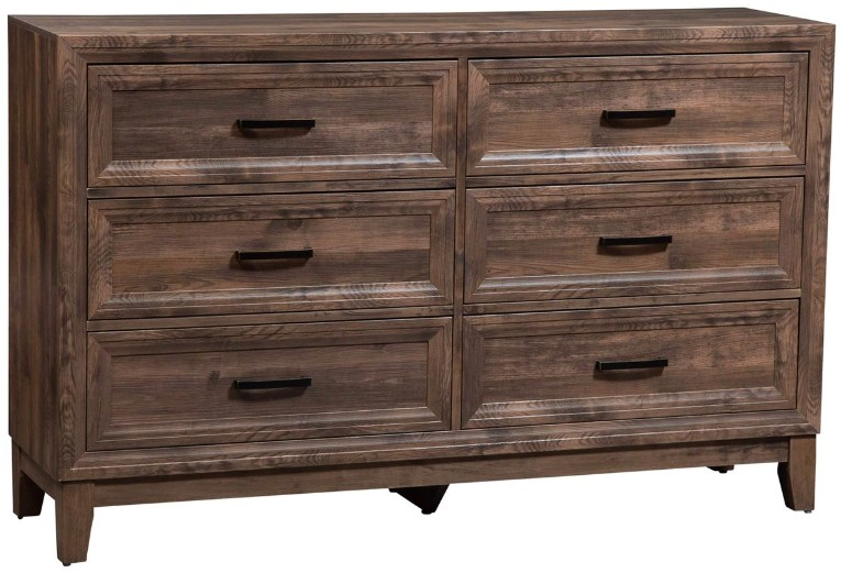 Enhance your room with this 6-drawer Ridgecrest dresser. The cobblestone finish is highlighted by the distressing and antique brass hardware. Softness is added with the picture frame case, tapered leg base, and canted moldings on the drawer fronts.Read More