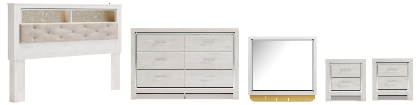 Includes queen bookcase headboard, mirrored dresser and 2 nightstands