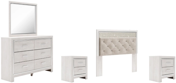 Includes queen upholstered panel headboard, two 2-drawer nightstands and 6-drawer dresser with mirror