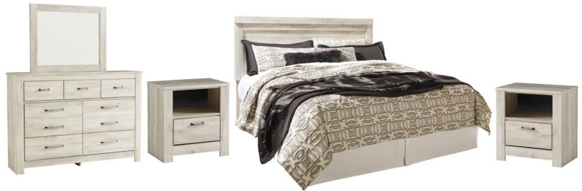 Includes panel headboard, 7-drawer dresser with mirror and two 1-drawer nightstands