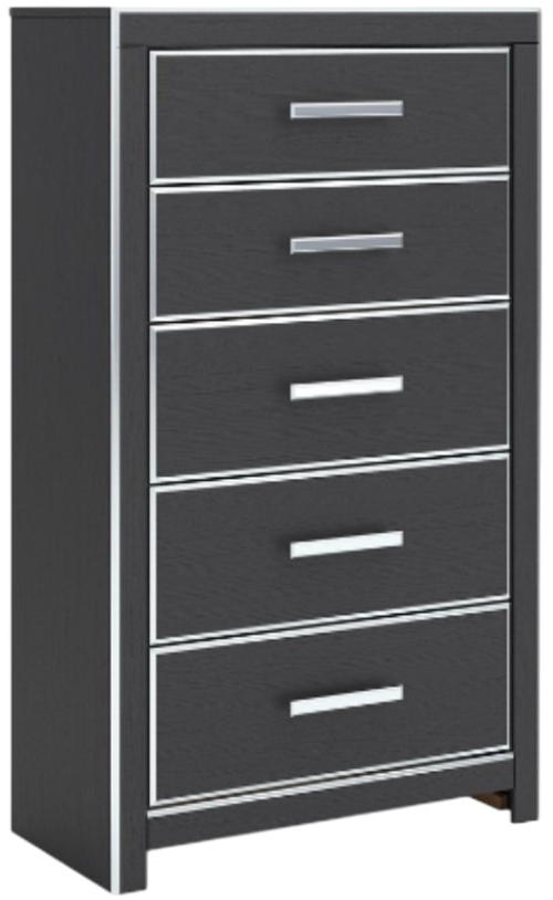 This sleek and modern chest adds bold sophistication to any bedroom with its deep black finish and clean-lined design. Five spacious drawers provide ample storage for clothing and essentials, while the contemporary look blends seamlessly with a variety of styles. Durable construction ensures long-lasting beauty and functionality.Read More
