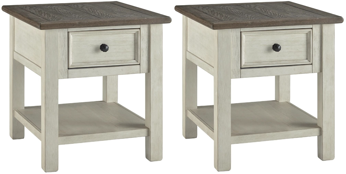 Whether your style is farmhouse fresh, shabby chic or country cottage, you’ll find the Bolanburg 2-piece end table set dressed to impress. Its two-tone, gently distressed finish pairs weathered oak with antique white for that much more quaint character. Charming elements include a plank-and-frame style top, black faceted hardware and smooth-gliding drawer storage for remote controls and more.Read More