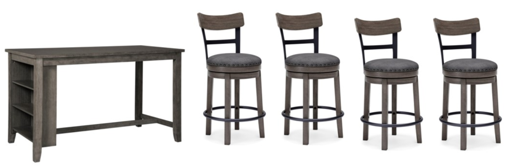 Perfect portion. Striking a simply chic pose, this dining room counter set serves up high style on a smaller scale. Its antiqued gray wash finish gives the clean-lined design a casually cool sensibility. Side shelves cleverly balance form and function. Bring a relaxed yet refined sense of good taste to a space with the upholstered swivel bar stool.Read More