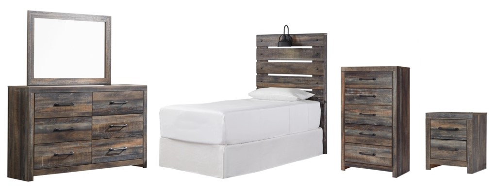Includes 6-drawer dresser with mirror, headboard, 5-drawer chest and 2-drawer nightstand