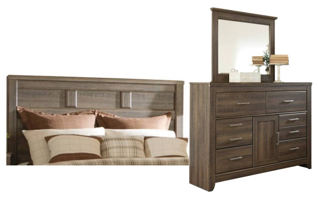 Includes panel headboard and 6-drawer dresser with mirror