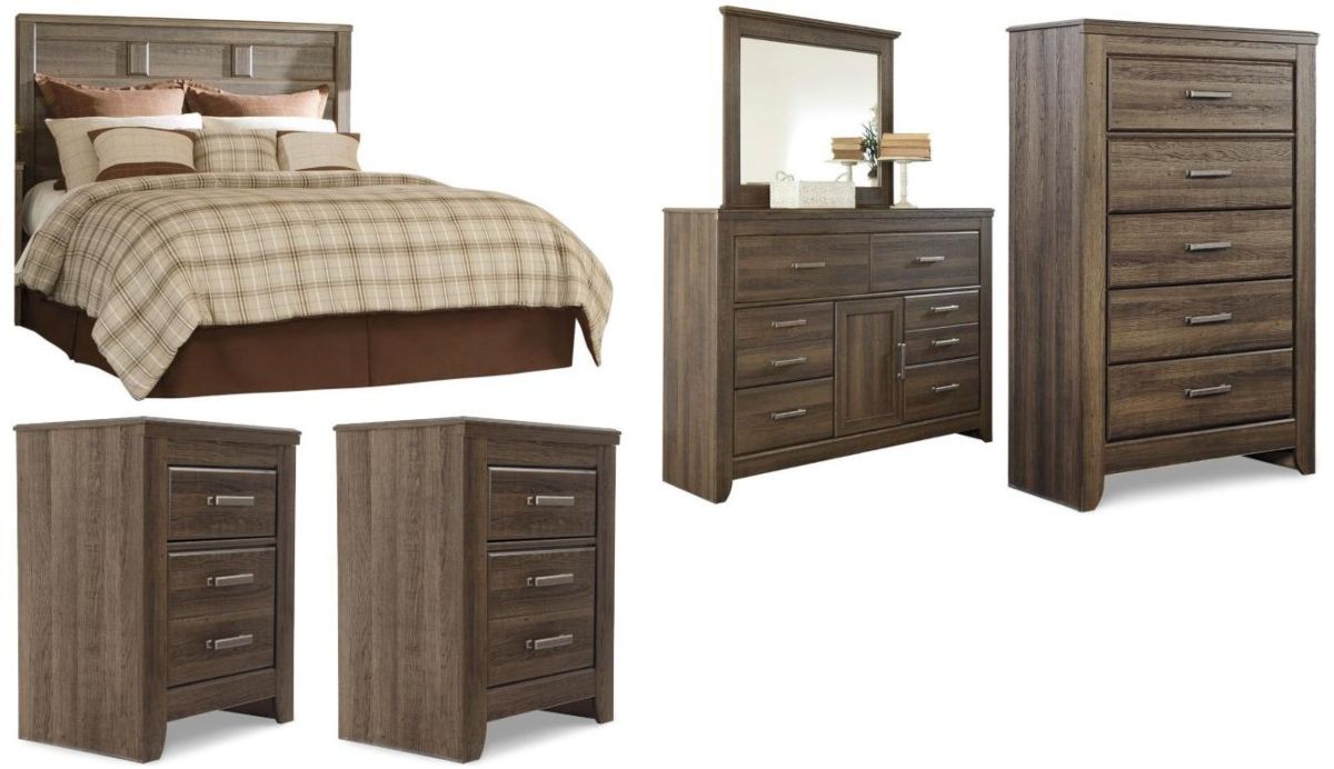 Includes panel headboard, 6-drawer dresser with mirror, 5-drawer chest and two 2-drawer nightstands