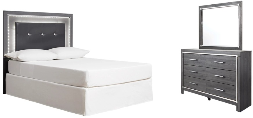 Reminiscent of Hollywood glamour of yesteryear, this bedroom set with full panel headboard and dresser/mirror interprets luxury in a decidedly modern way. Headboard details include button-tufted upholstery, faceted faux crystals and LED lights enhanced with remote-controlled settings for color and brightness. Chrome-tone drawer pulls and accents are a chic complement to the dazzling gray finish.Read More