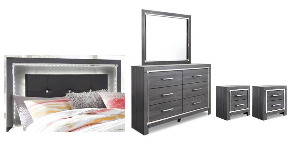 Reminiscent of Hollywood glamour of yesteryear, this bedroom set with full panel headboard, dresser/mirror and dual nightstands interprets luxury in a decidedly modern way. Headboard details include button-tufted upholstery, faceted faux crystals and LED lights enhanced with remote-controlled settings for color and brightness. Chrome-tone drawer pulls and accents are a chic complement to the dazzling gray finish.Read More