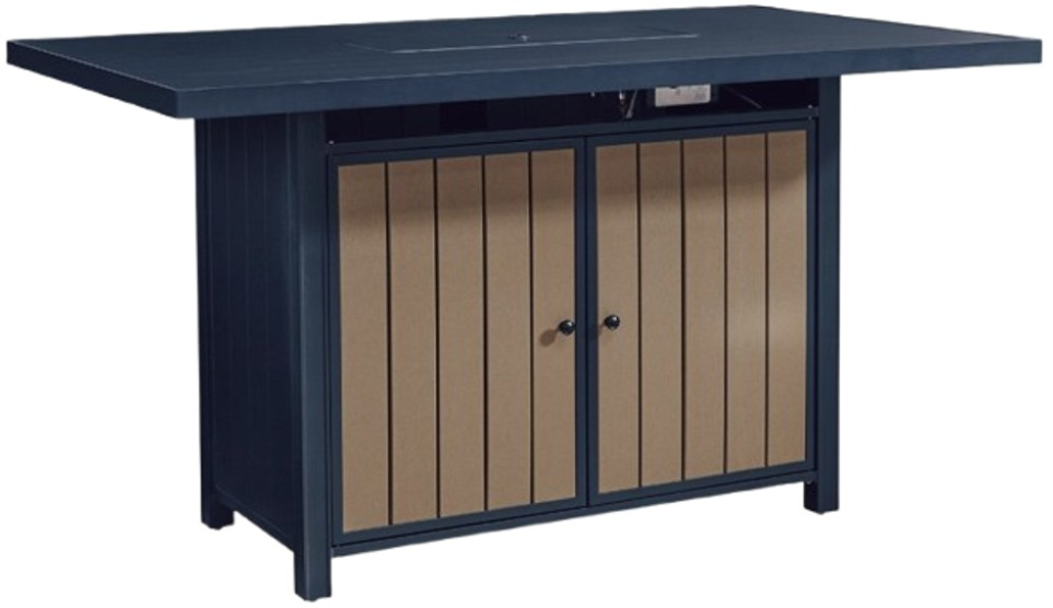 Easy-breezy beauty, made to withstand the elements. This outdoor bar table with fire pit makes a serene statement with its soothing shade of blue and contrasting wood-look cabinets. An integrated fire pit in the top adds a perfectly cozy vibe. Crafted with durable materials for added longevity.Read More