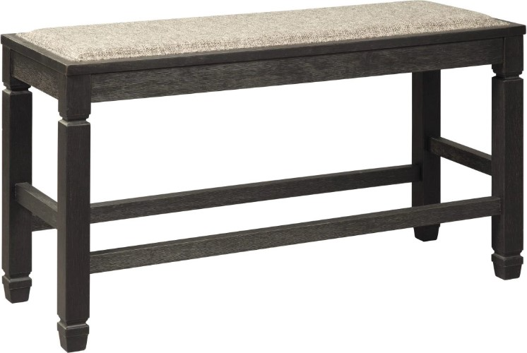 Invite your family into the heart of your home with this upholstered dining room bench. X-shape stretcher and tapered legs are a sturdy foundation, while the counter-height design raises the bar on fine dining. Textured black finish and heavy woven neutral upholstery accented with silvertone nailhead trim is trend-right urban farmhouse style.Read More