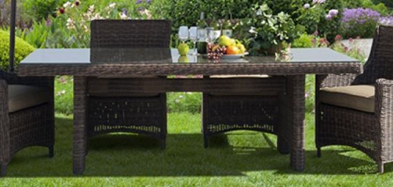 Sunny Design Outdoor Miami Dining Table offers a wicker style base with a glass table top. This table is a perfect add on to the backyard patio.